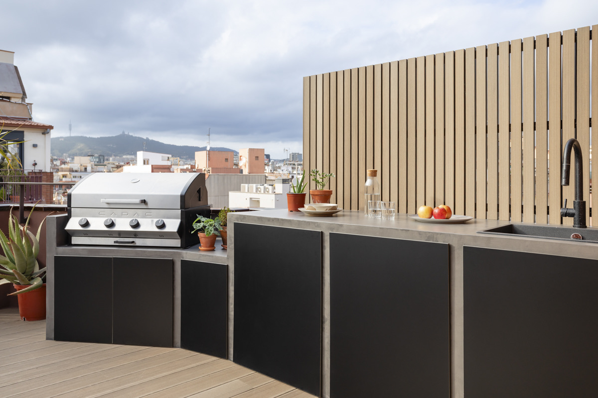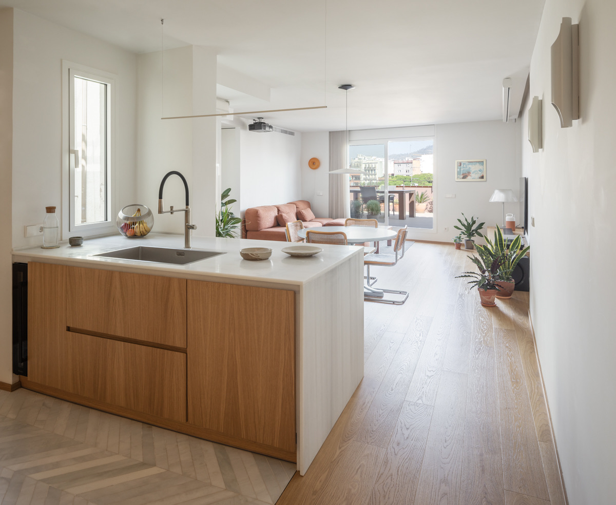 A full renovation of the penthouse of a 1970s building in Barcelona’s La Bordeta neighborhood transforms two apartments into a single warm, functional, and light-filled home.